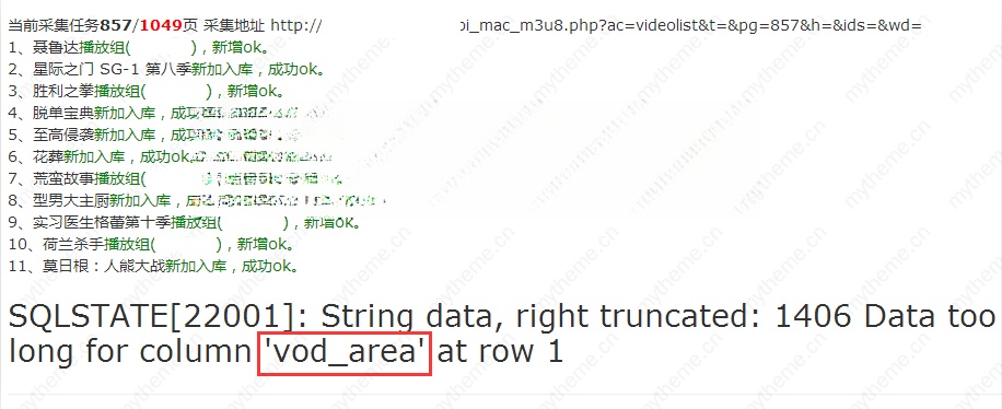 一般报错基本是语言(vod_lang)和地域(vod_area)两个字段采集的数据超过了数据表字段的类型长度限制