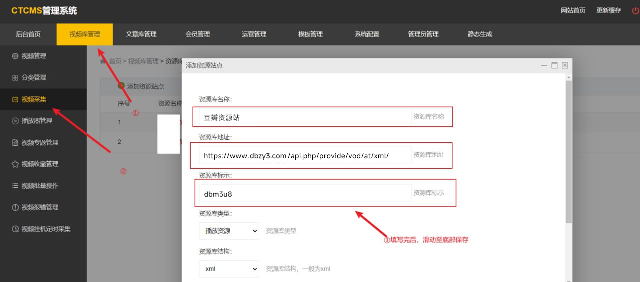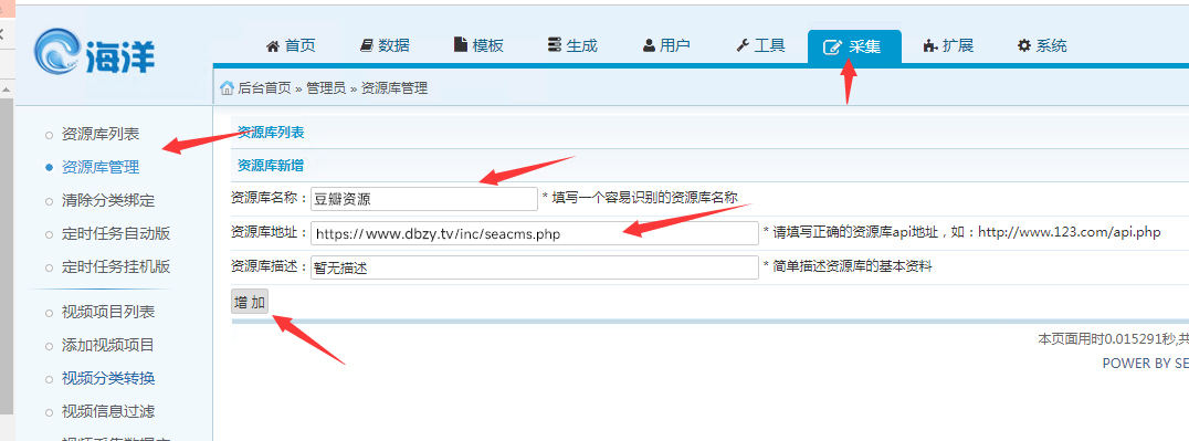 请按以下步骤进行:依次点击【采集】-【采集资源库管理】,然后依次输入