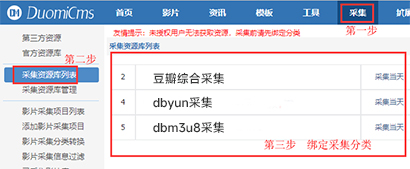 需要采集时,依次点击【采集】-【采集资源库列表】-豆瓣资源站具体操作如下图